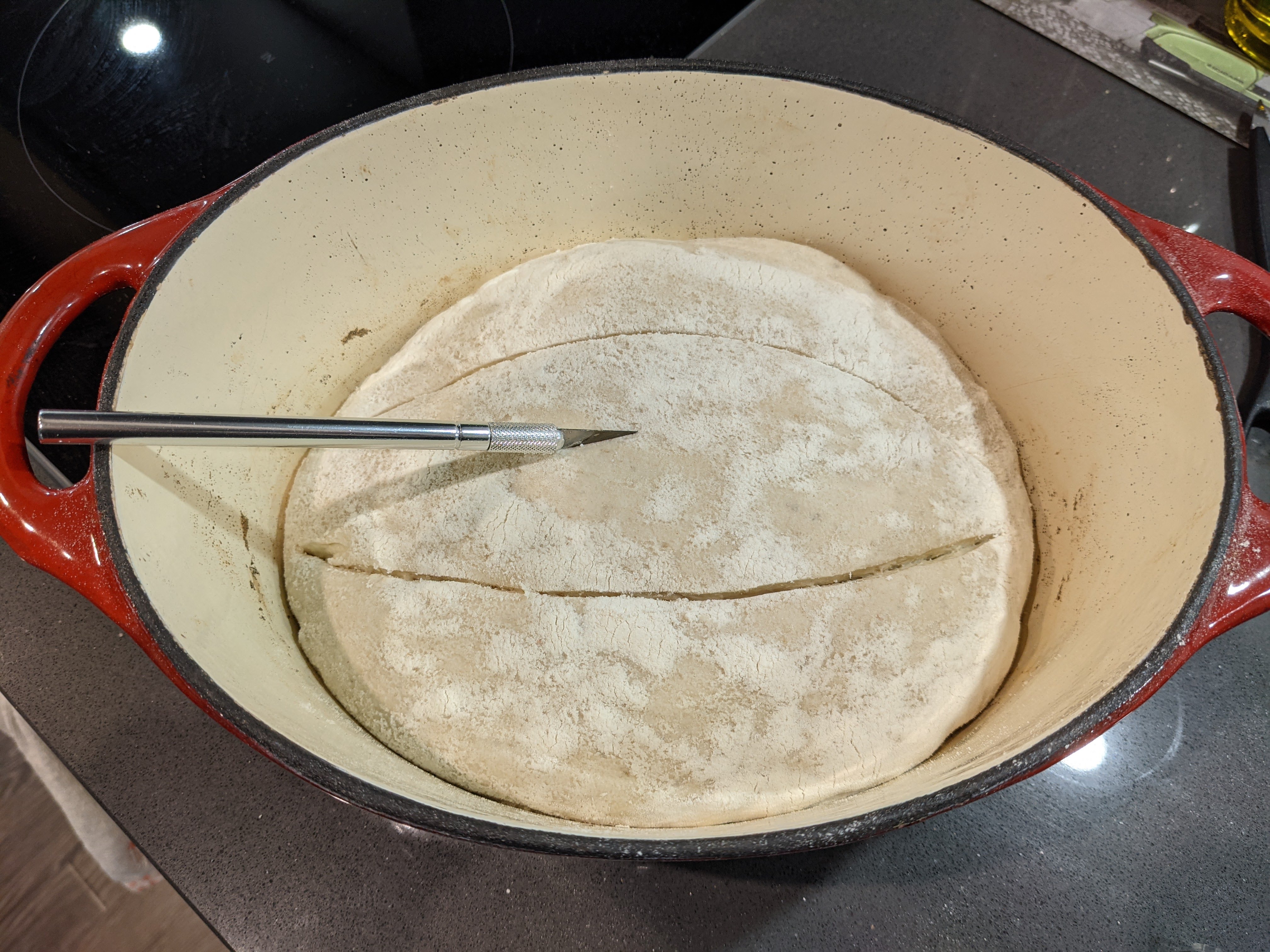 ...Bread in the pot, scored, and ready to bake...